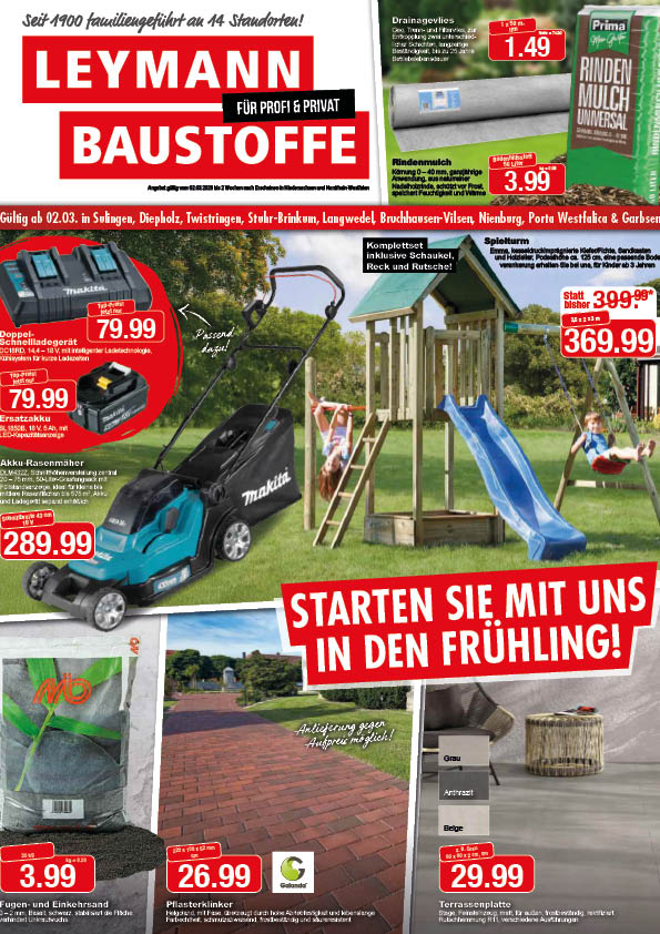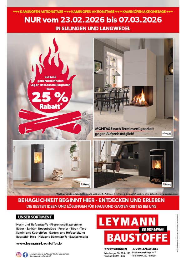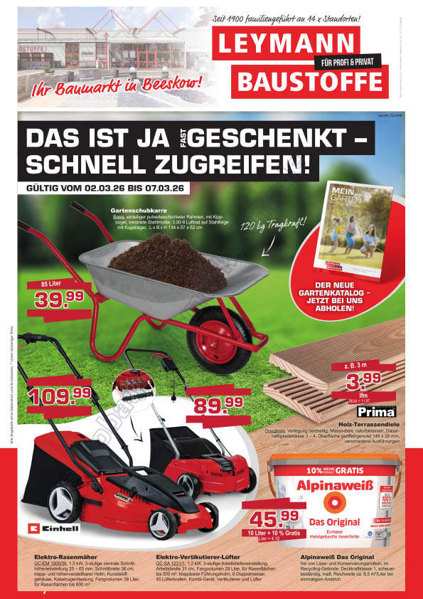 *Rechtlicher Hinweis: Der Artikel des Monats ist in allen Leymann Baustoffe Filialen erhältlich, solange der Vorrat reicht. Alle Preise verstehen sich in Euro inklusive der gesetzlichen Mehrwertsteuer, ohne Dekoration und Zubehör. Druckfehler, Irrtümer und technische Änderungen vorbehalten. Angebote gültig eine Woche ab Erscheinungsdatum des Prospekts, solange der Vorrat reicht. Abbildungen können vom Original abweichen.