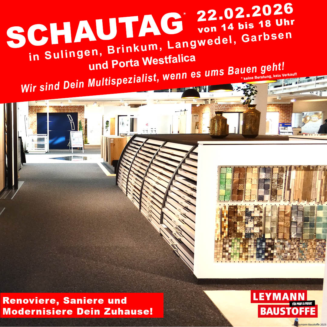 Am Sonntag, 22.02.2026, lädt Sie die Leymann Baustoffe Filiale Hannover-Garbsen von 14 bis 18 Uhr zum Schautag ein.